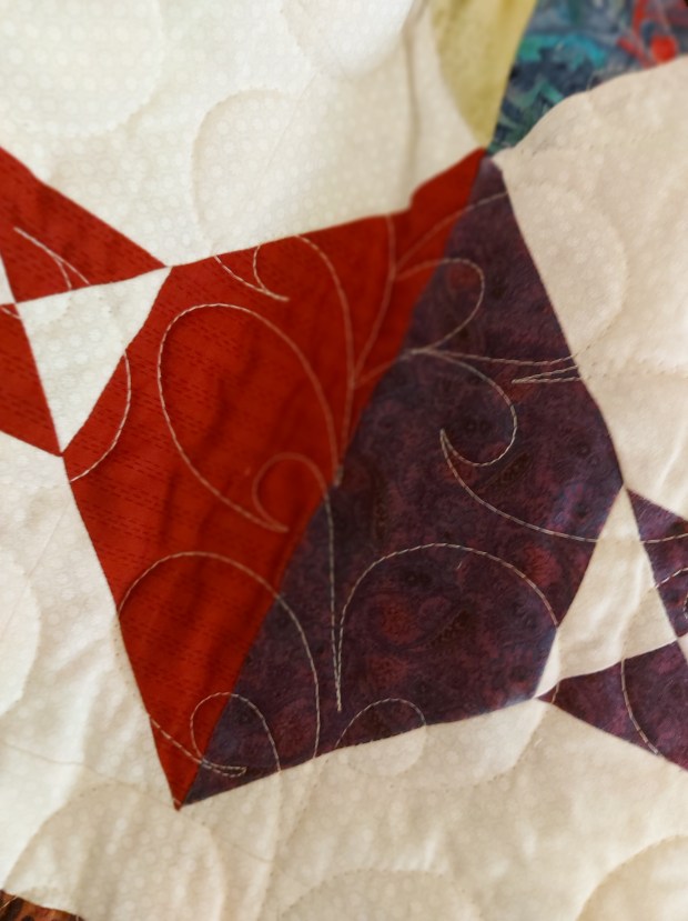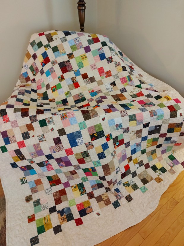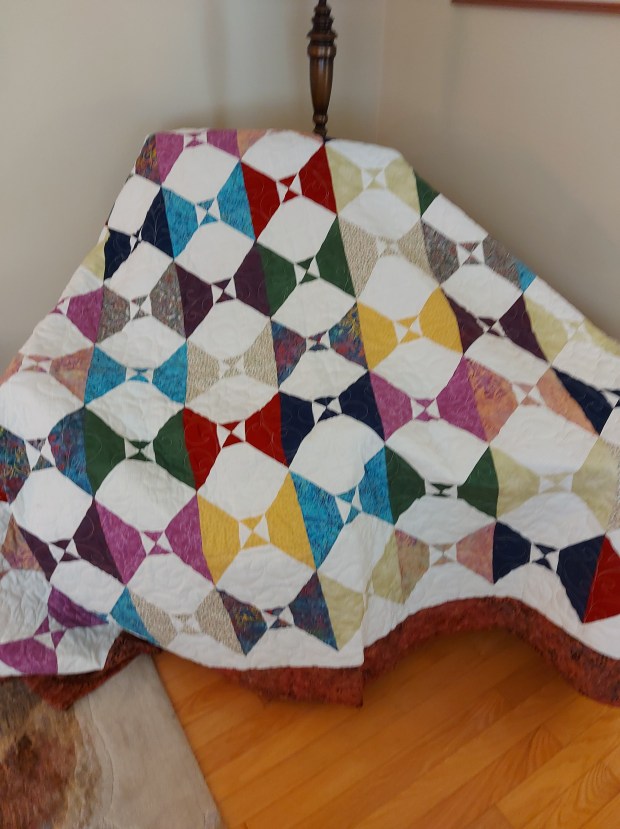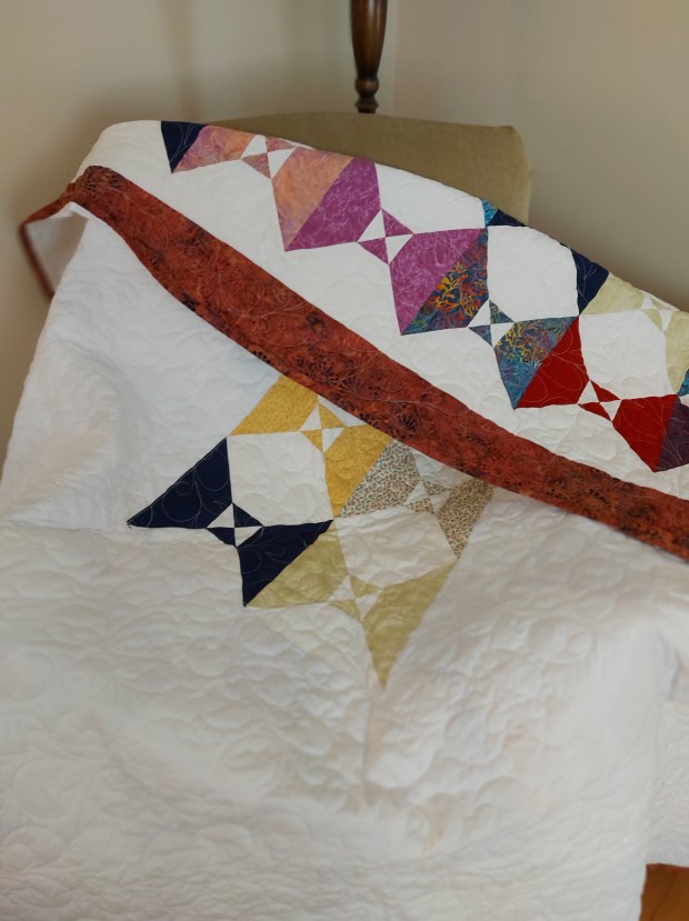 Size: 70″ x 80 ” 100 Percent Cotton White Backing Binding Hand Stitched